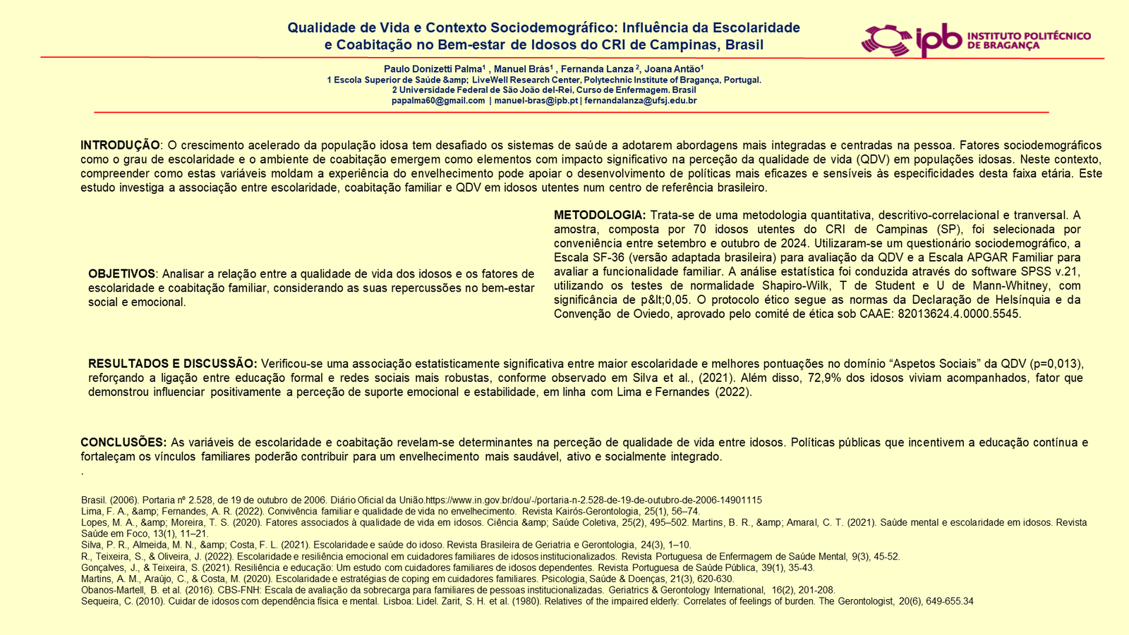 PO5Qualidade de Vida e Contexto Sociodemográfico: Influência da Escolaridade e Coabitação no Bem-estar de Idosos do CRI de Campinas, Brasil
